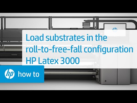 Learn how to load a substrate in the roll-to-free-fall configuration on the HP Latex 3000 printer. Use roll-to-free-fall when you want to cut prints as soon as they are printed. The roll-to-collector option adds a collector roller and loop shaper.